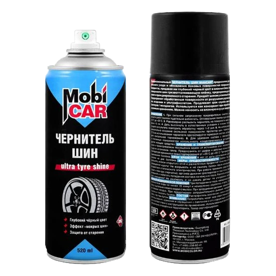 Чернитель шин Mobicar эффект мокрых шин, 520 мл 0509-01 MC предназначен для профессионального ухода и обновления боковых поверхностей покрышек и резиновых молдингов, придавая им глубокий черный цвет и влажный блеск.