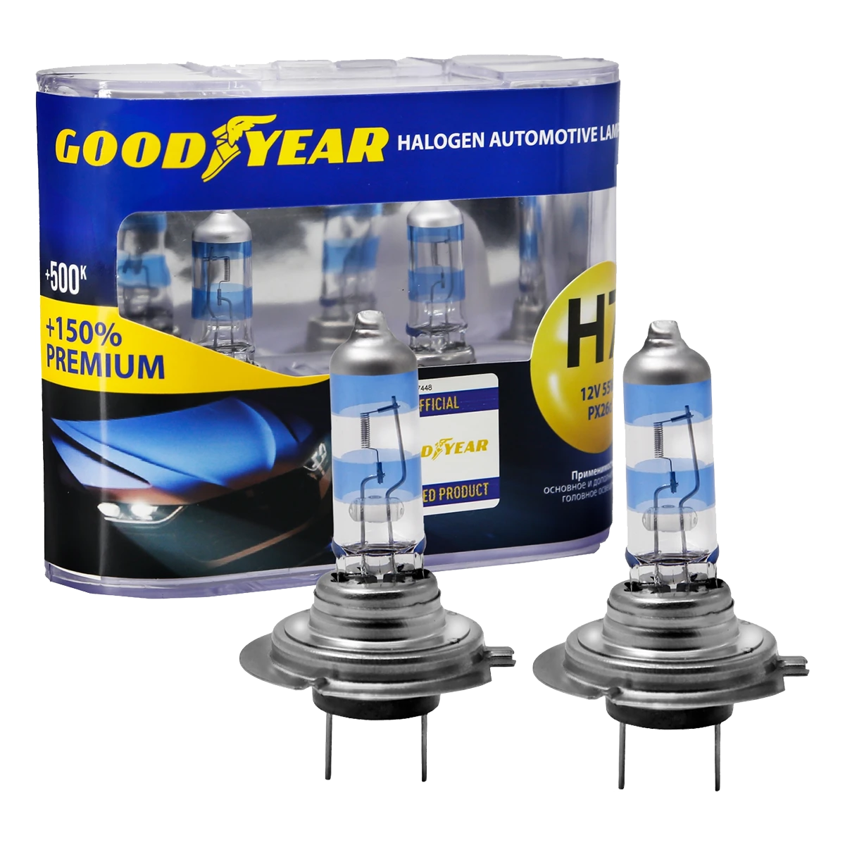 Галогенные лампы Goodyear Premium +150% H7 сочетают в себе преимущества серий More Light и Super White. Лампы H7 используются в фарах ближнего и дальнего освещения, противотуманных фонарях.