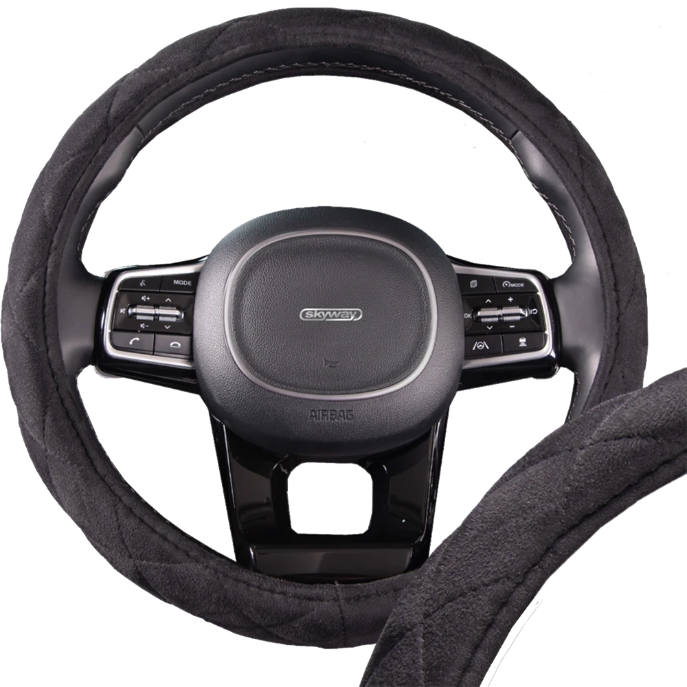 Оплетка замша M Hit- 1 SKYWAY Черная — оплётка защищает от повреждений, скрывает имеющиеся потёртости и царапины. Изготавливается из бархатистой замши, которая отличается мягкой текстурой и очень приятная на ощупь. В зимний период замшевые оплётки нехолодные, а летом не нагреваются на солнце и исключают опасное проскальзывание рук по рулевому колесу. В производстве TM SKYWAY используются только качественные, экологически чистые материалы. Аккуратные и крепкие швы — гарантия высокой долговечности оплётки. Внутренняя поверхность сделана из противоскользящих материалов. Лаконичный дизайн, строгие линии, интересная прострочка добавят шарма салону автомобиля, выгодно подчеркнув вкус его владельца.