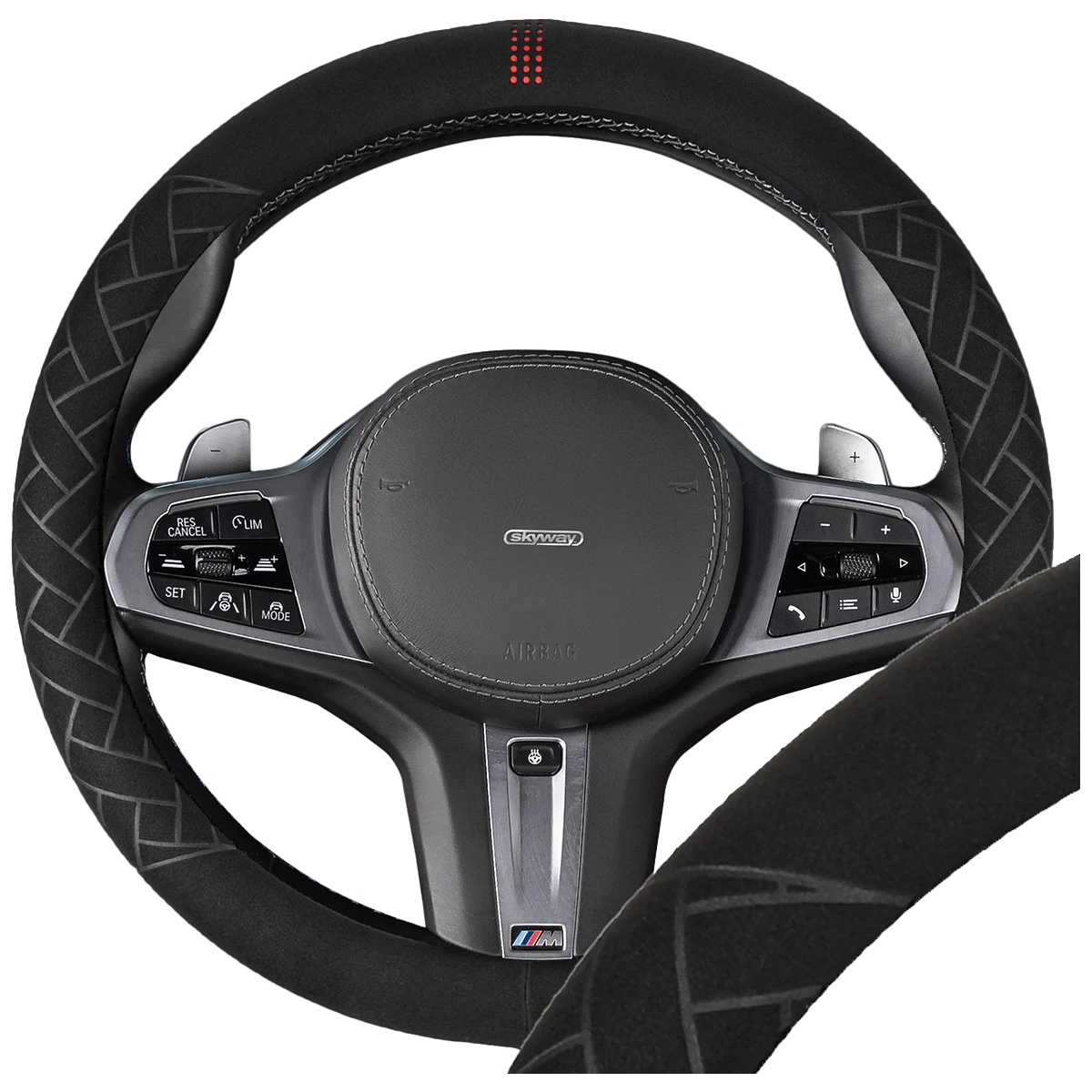 Оплетка искусственная замша M (37-39 см) SKYWAY Design Hit-5 Черная/красная — оплётка защищает от повреждений, скрывает имеющиеся потёртости и царапины. Изготавливается из бархатистой замши, которая отличается мягкой текстурой и очень приятная на ощупь. В зимний период замшевые оплётки нехолодные, а летом не нагреваются на солнце и исключают опасное проскальзывание рук по рулевому колесу. В производстве TM SKYWAY используются только качественные, экологически чистые материалы. Аккуратные и крепкие швы — гарантия высокой долговечности оплётки. Внутренняя поверхность сделана из противоскользящих материалов. Лаконичный дизайн, строгие линии, интересная прострочка добавят шарма салону автомобиля, выгодно подчеркнув вкус его владельца.